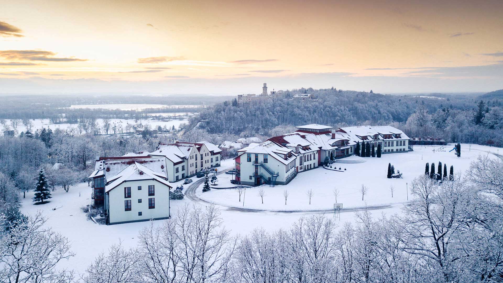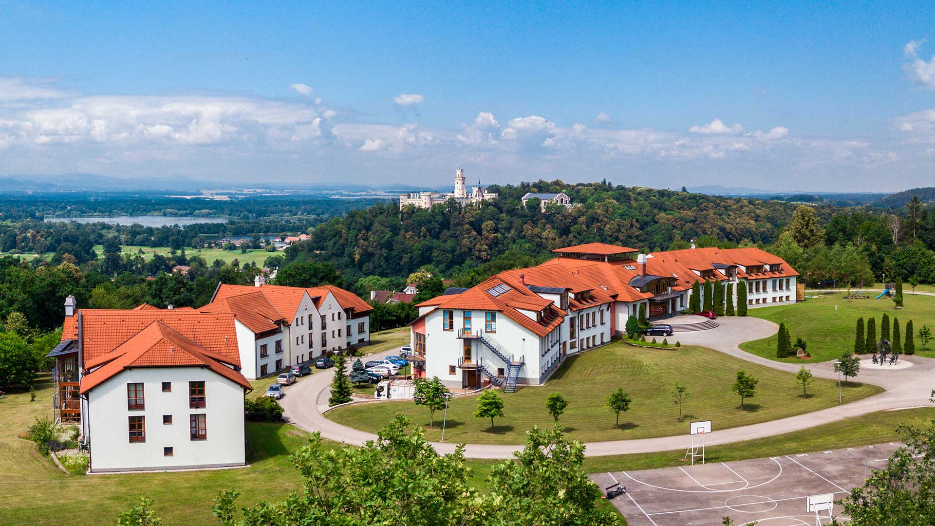 汤森大学坐落在一座小山上,俯瞰 13 世纪的城堡、赫卢博卡山谷以及远处的奥地利山丘,校园和周围乡村的宁静美景让游客惊叹不已。